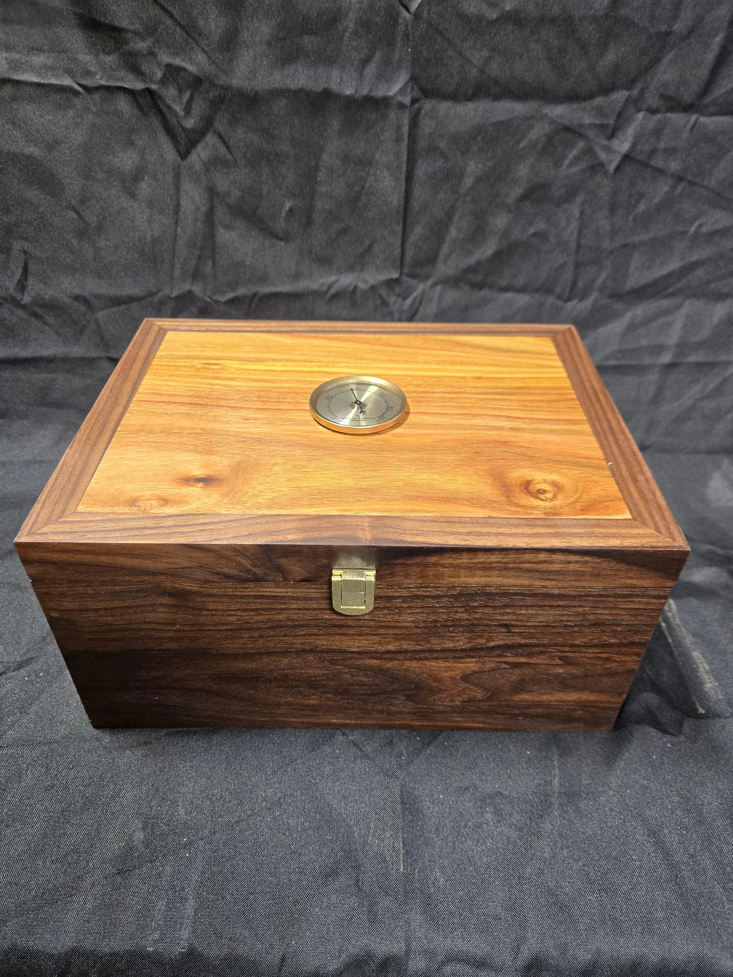Humidor box is made with walnut and zebra wood hardwoods. Spanish cedar lines the interior for optimal humidity control.
